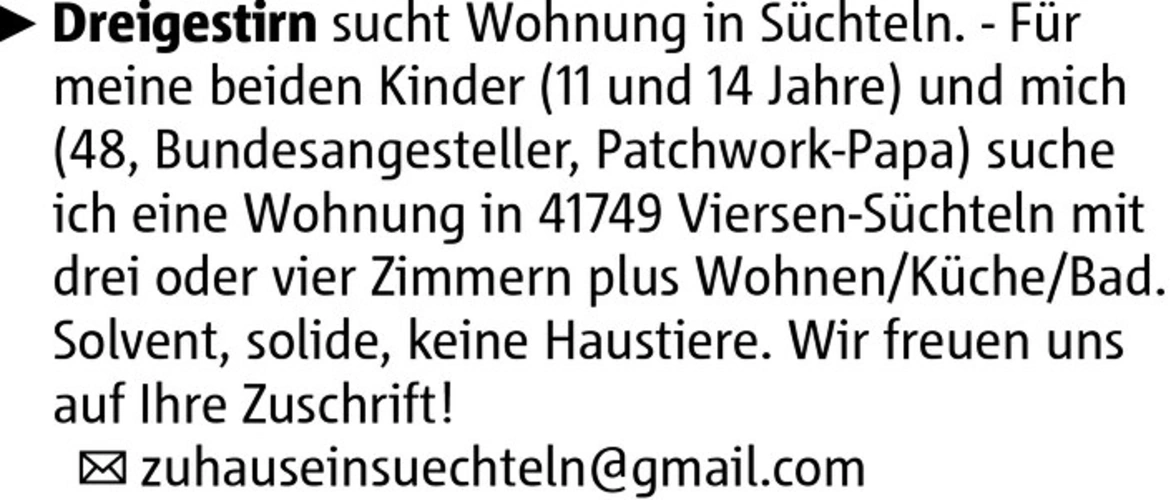 Dreigestirn sucht Wohnung in Süchteln. - Für meine beiden Kinder (11 und 14 Jahre) und mich (48, Bundesangesteller, Patchwork-Papa) suche ich eine Wohnung in 41749 Viersen-Süchteln mit drei oder vier Zimmern plus Wohnen/Küche/Bad. Solvent, solide, keine Haustiere. Wir freuen uns auf Ihre Zuschrift! zuhauseinsuechteln@gmail.com