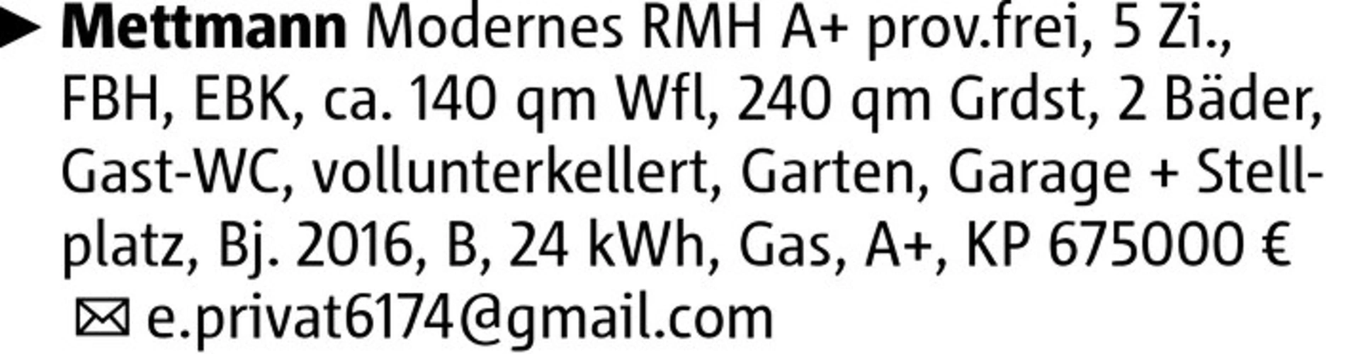 Mettmann Modernes RMH A+ prov.frei, 5 Zi., FBH, EBK, ca. 140 qm Wfl, 240 qm Grdst, 2 Bäder, Gast-WC, vollunterkellert, Garten, Garage + Stellplatz, Bj. 2016, B, 24 kWh, Gas, A+, KP 675000 € e.privat6174@gmail.com