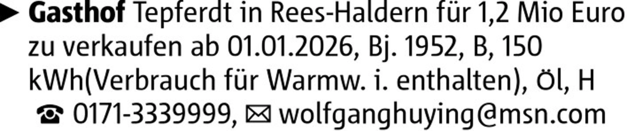 Gasthof Tepferdt in Rees-Haldern für 1,2 Mio Euro zu verkaufen ab 01.01.2026, Bj. 1952, B, 150 kWh(Verbrauch für Warmw. i. enthalten), Öl, H 0171-3339999, wolfganghuying@msn.com