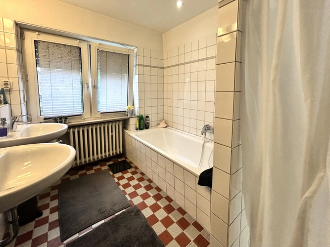 Das Badezimmer verfügt über eine Dusche, eine Badewanne, eine Toilette, zwei Waschbecken und ein Fenster für eine optimale Belüftung.