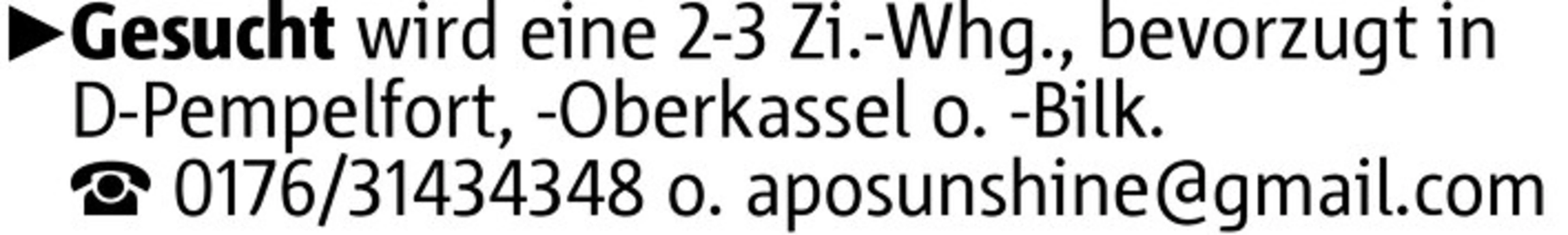 Gesucht wird eine 2-3 Zi.-Whg., bevorzugt in D-Pempelfort, -Oberkassel o. -Bilk. 0176/31434348 o. aposunshine@gmail.com