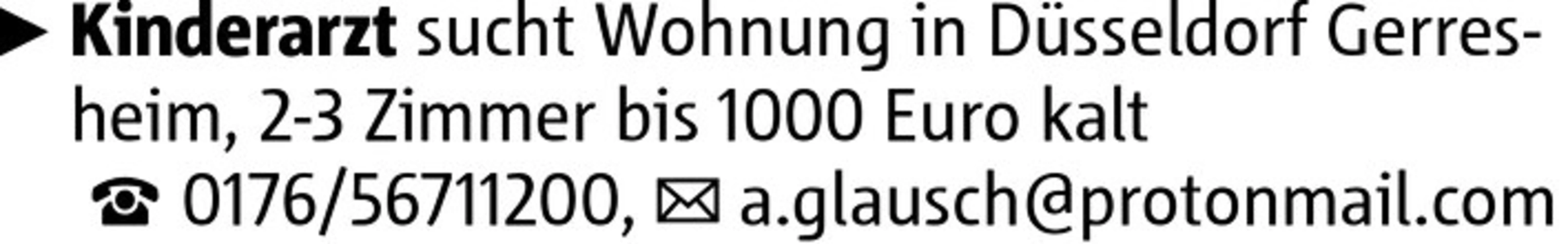 Kinderarzt sucht Wohnung in Düsseldorf Gerresheim, 2-3 Zimmer bis 1000 Euro kalt 0176/56711200, a.glausch@protonmail.com