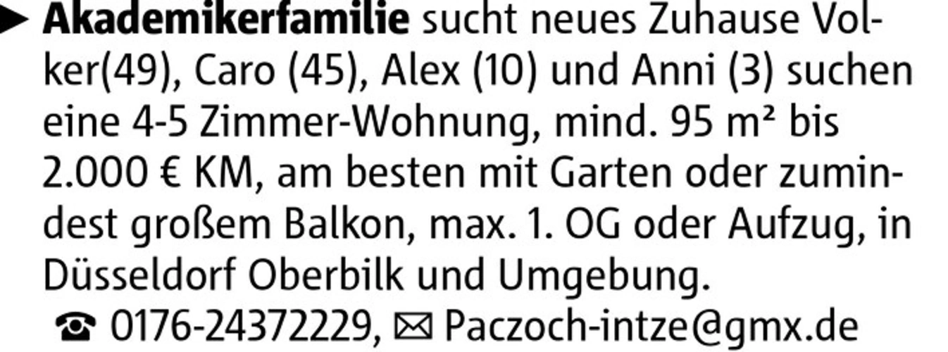 Akademikerfamilie sucht neues Zuhause Volker(49), Caro (45), Alex (10) und Anni (3) suchen eine 4-5 Zimmer-Wohnung, mind. 95 m² bis 2.000 € KM, am besten mit Garten oder zumindest großem Balkon, max. 1. OG oder Aufzug, in Düsseldorf Oberbilk und Umgebung. 0176-24372229, Paczoch-intze@gmx.de