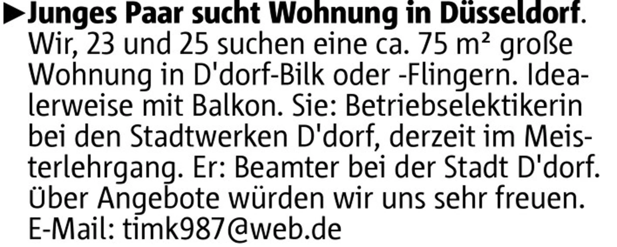 Junges Paar sucht Wohnung in Düsseldorf. Wir, 23 und 25 suchen eine ca. 75 m² große Wohnung in D'dorf-Bilk oder -Flingern. Idealerweise mit Balkon. Sie: Betriebselektrikerin bei den Stadtwerken D'dorf, derzeit im Meisterlehrgang. Er: Beamter bei der Stadt D'dorf. Über Angebote würden wir uns sehr freuen. E-Mail: timk987@web.de