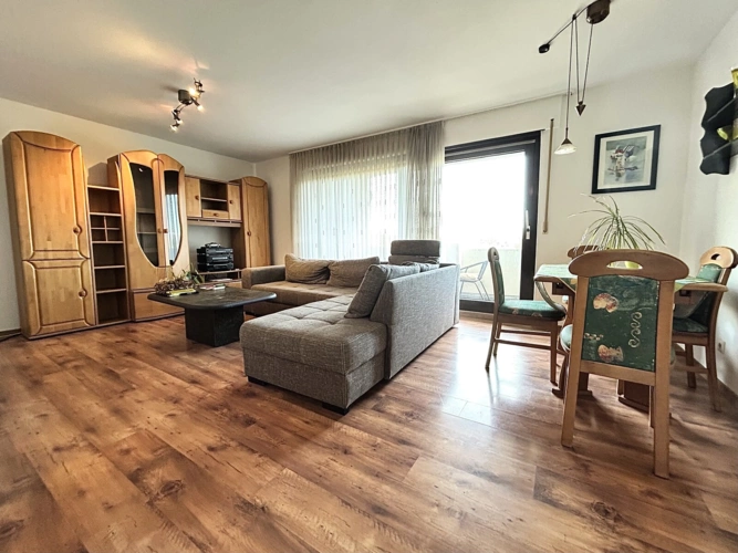 Das großzügige Wohn- und Esszimmer überzeugt durch eine breite Fensterfront, die viel Tageslicht hereinlässt und den direkten Zugang zum Balkon ermöglicht. Von dort aus eröffnet sich ein beruhigender Blick ins Grüne ein perfekter Ort zum Entspannen.