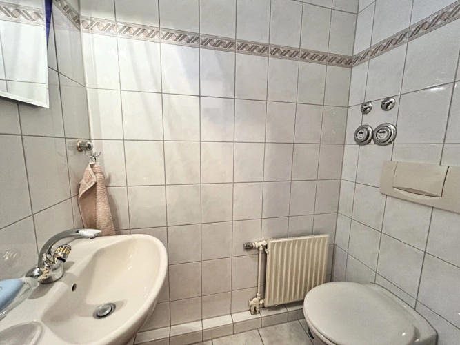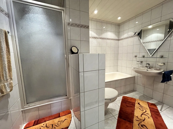 Das Badezimmer ist mit einer Badewanne als auch einer separaten Dusche ausgestattet, ergänzt durch ein separates Gäste-WC für zusätzlichen Komfort.