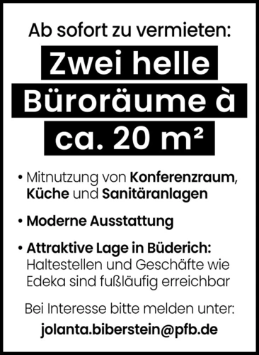 Ab sofort zu vermieten: Zwei helle Büroräume à ca. 20 m² Mitnutzung von Konferenzraum, Küche und Sanitäranlagen Moderne Ausstattung Attraktive Lage in Büderich: Haltestellen und Geschäfte wie Edeka sind fußläufig erreichbar Bei Interesse bitte melden unter: jolanta.biberstein@pfb.de