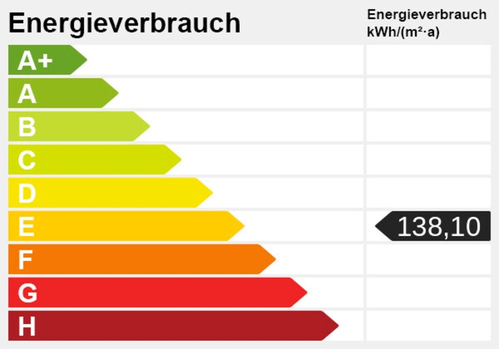 Es liegt ein Energieverbrauchsausweis vor. Dieser ist gültig bis 27.5.2024. Endenergieverbrauch beträgt 138.10 kwh/(m²*a). Wesentlicher Energieträger der Heizung ist Gas. Das Baujahr des Objekts lt. Energieausweis ist 1953. Die Energieeffizienzklasse ist E.