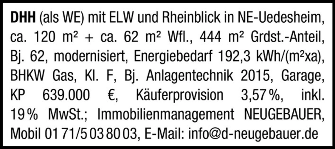 DHH (als WE) mit ELW und Rheinblick in NE-Uedesheim, ca. 120 m² + ca. 62 m² Wfl., 444 m² Grdst.-Anteil, Bj. 62, modernisiert, Energiebedarf 192,3 kWh/(m²xa), BHKW Gas, Kl. F, Bj. Anlagentechnik 2015, Garage, KP 639.000 €, Käuferprovision 3,57 %, inkl. 19 % MwSt.; Immobilienmanagement NEUGEBAUER, Mobil 01 71/5 03 80 03, E-Mail: info@d-neugebauer.de