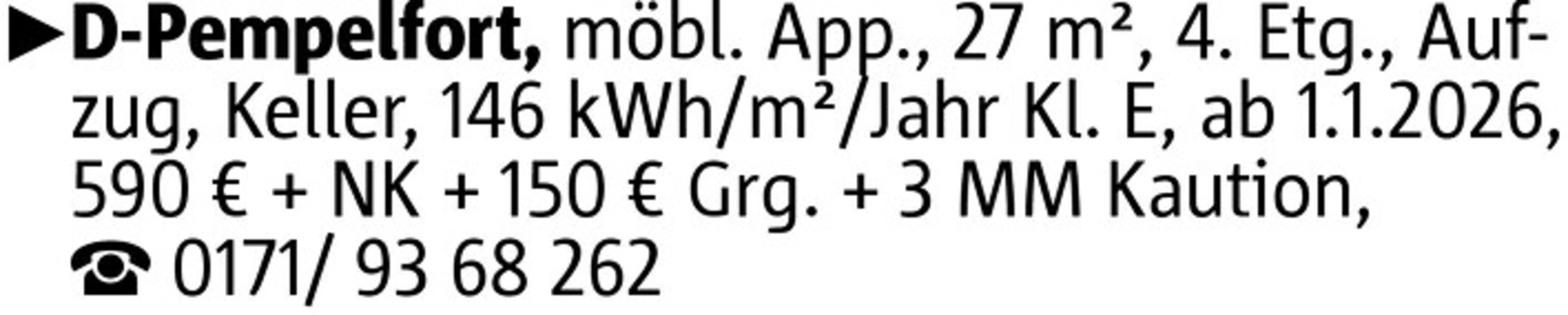 App., 27 m², 4. Etg., Aufzug, Keller, 146 kWh/m²/Jahr Kl. E, ab 1.1.2026, 590 € + NK + 150 € Grg. + 3 MM Kaution