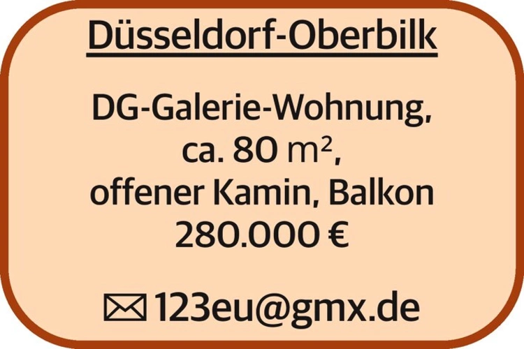 Düsseldorf-Oberbilk DG-Galerie-Wohnung, ca. 80 m², offener Kamin, Balkon 280.000 € 123eu@gmx.de
