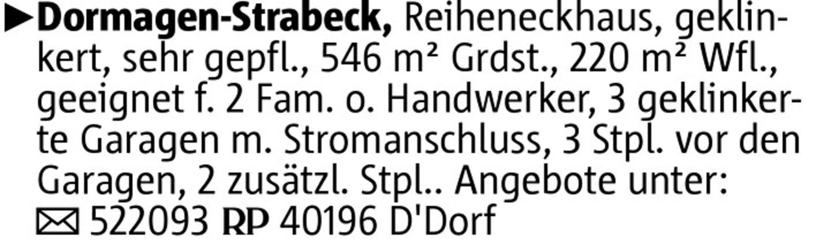 Dormagen-Strabeck, Reiheneckhaus, geklinkert, sehr gepfl., 546 m² Grdst., 220 m² Wfl., geeignet f. 2 Fam. o. Handwerker, 3 geklinkerte Garagen m. Stromanschluss, 3 Stpl. vor den Garagen, 2 zusätzl. Stpl.. Angebote unter: 522093 40196 D'Dorf