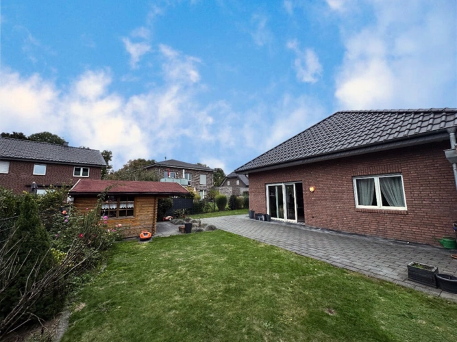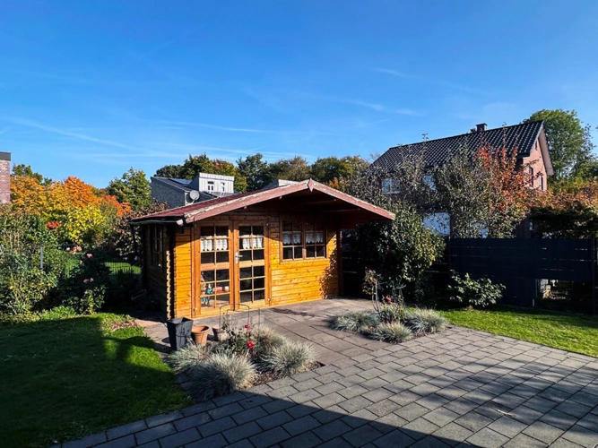 Der Garten ist pflegeleicht angelegt und eingefriedet. Ein großzügiges Gartenhaus rundet das Außenangebot perfekt ab.