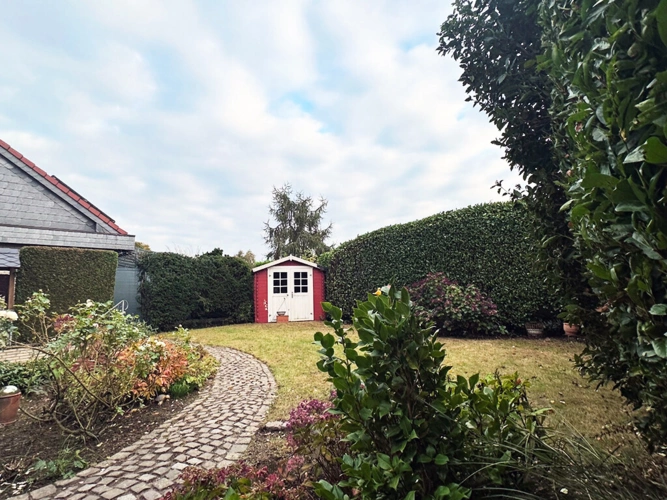 Der liebevoll angelegte Garten lädt zum Spielen und Toben bzw. zum Relaxen auf der teilüberdachten Südterrasse ein.