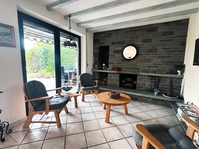 Das Erdgeschoss ermöglicht barrierearmes Wohnen. Mittelpunkt hier ist das große, angenehm helle Wohn- und Esszimmer mit gemütlicher Kaminecke. Großflächige Fensterelemente sorgen für ein freundliches Wohnambiente.