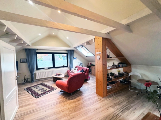 Das Dachgeschoss ist ein Traum. Sichtbare Holzbalken und wohnliche Atmosphäre zeichnen diesen Bereich aus.