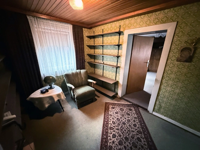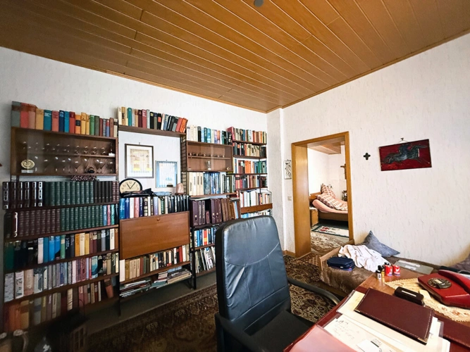 Erdgeschoss: Wohnzimmer, Schlafzimmer, Büro I, Büro II, Küche, Flur, Bad (mit Wanne und Dusche), Gäste-WC, Abstellraum