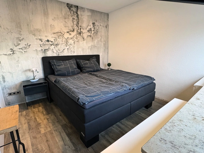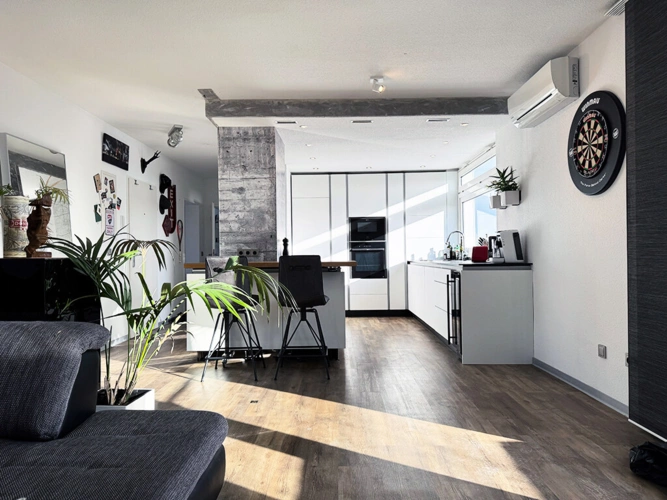 Wohnzimmer mit Dachterrassenzugang und angrenzender offener Küche (mit Sitzgelegenheit), Schlafzimmer, Büro (respektive Kinderzimmer), Flur, Bad, Gäste-WC