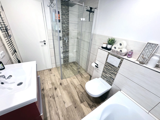 Obergeschoss: Elternschlafzimmer, Kinderzimmer I, Kinderzimmer II, Flur, Bad (mit ebenerdiger Dusche, Wanne, WC und Waschtisch)