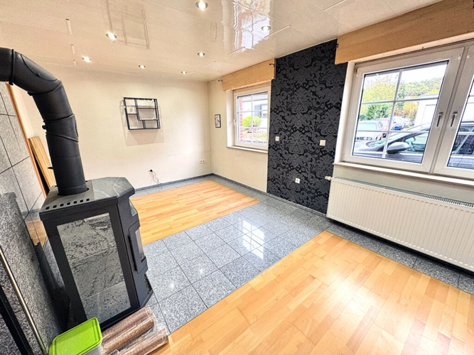 Erdgeschoss: Wohnzimmer (mit Kaminofen), Esszimmer, Küche, Flur, Bad (mit ebenerdiger Dusche, Wanne, WC und Waschtisch)