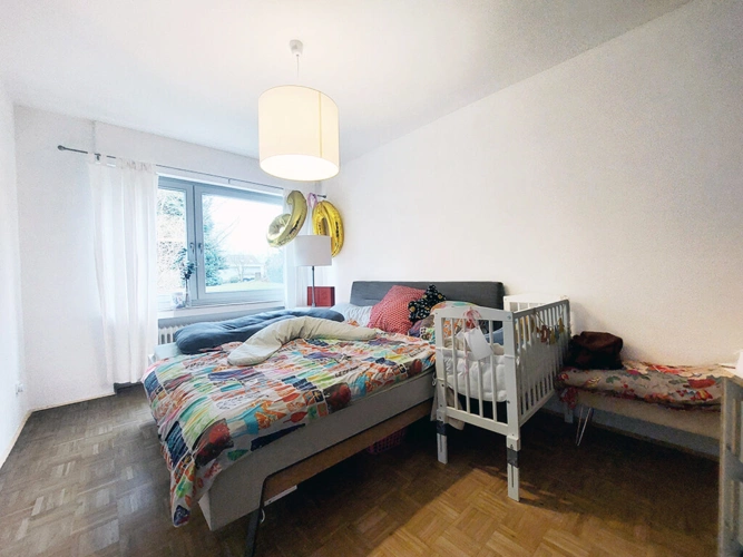 Wohnungen rechts: Wohn- und Esszimmer, Küche, Diele, Bad, Abstellraum, Elternschlafzimmer, Kinderzimmer (respektive Büro) und Balkon