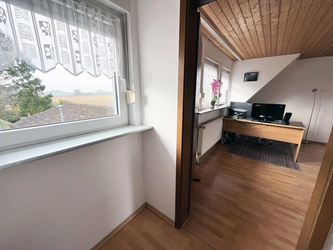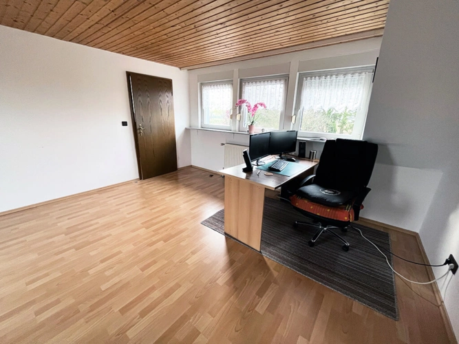 Dachgeschoss: Elternschlafzimmer, Kinderzimmer I, Kinderzimmer II (respektive Büro), Flur, Bad (mit Dusche) und Balkon