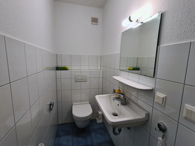 Wohn- und Esszimmer mit angrenzender Küche (und Balkonzugang), Flur, Bad (mit Dusche), Gäste-WC, Elternschlafzimmer, Kinderzimmer