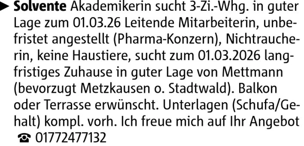 Solvente Akademikerin sucht 3-Zi.-Whg. in guter Lage zum 01.03.26 Leitende Mitarbeiterin, unbefristet angestellt (Pharma-Konzern), Nichtraucherin, keine Haustiere, sucht zum 01.03.2026 langfristiges Zuhause in guter Lage von Mettmann (bevorzugt Metzkausen o. Stadtwald). Balkon oder Terrasse erwünscht. Unterlagen (Schufa/Gehalt) kompl. vorh. Ich freue mich auf Ihr Angebot 01772477132