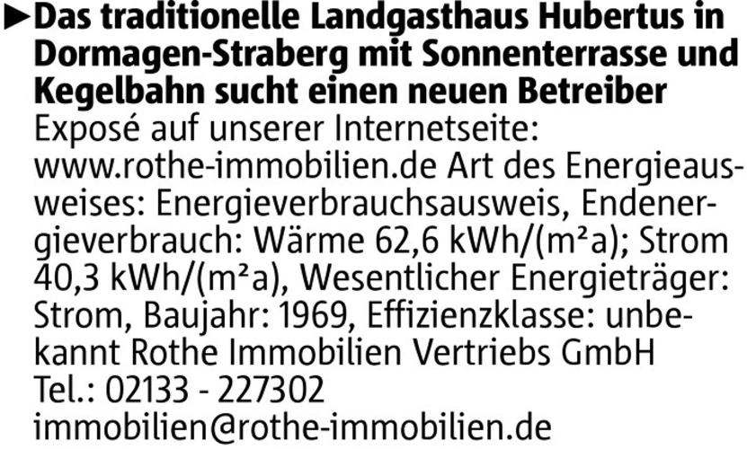 Das traditionelle Landgasthaus Hubertus in Dormagen-Straberg mit Sonnenterrasse und Kegelbahn sucht einen neuen Betreiber Exposé auf unserer Internetseite: www.rothe-immobilien.de Art des Energieausweises: Energieverbrauchsausweis, Endenergieverbrauch: Wärme 62,6 kWh/(m²a); Strom 40,3 kWh/(m²a), Wesentlicher Energieträger: Strom, Baujahr: 1969, Effizienzklasse: unbekannt Rothe Immobilien Vertriebs GmbH Tel.: 02133 - 227302 immobilien@rothe-immobilien.de