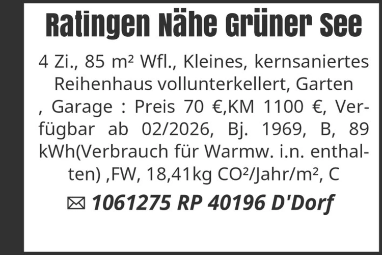 Ratingen Nähe Grüner See 4 Zi., 85 m² Wfl., Kleines, kernsaniertes Reihenhaus vollunterkellert, Garten, Garage : Preis 70 €,KM 1100 €, Verfügbar ab 02/2026, Bj. 1969, B, 89 kWh(Verbrauch für Warmw. i.n. enthalten) ,FW, 18,41kg CO²/Jahr/m², C 1061275 RP 40196 D'Dorf