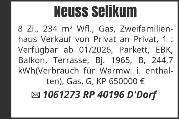 Neuss Selikum 8 Zi., 234 m² Wfl., Gas, Zweifamilienhaus Verkauf von Privat an Privat, 1: Verfügbar ab 01/2026, Parkett, EBK, Balkon, Terrasse, Bj. 1965, B, 244,7 kWh (Verbrauch für Warmw. i. enthalten), Gas, G, KP 650000 € 1061273 RP 40196 D'Dorf
