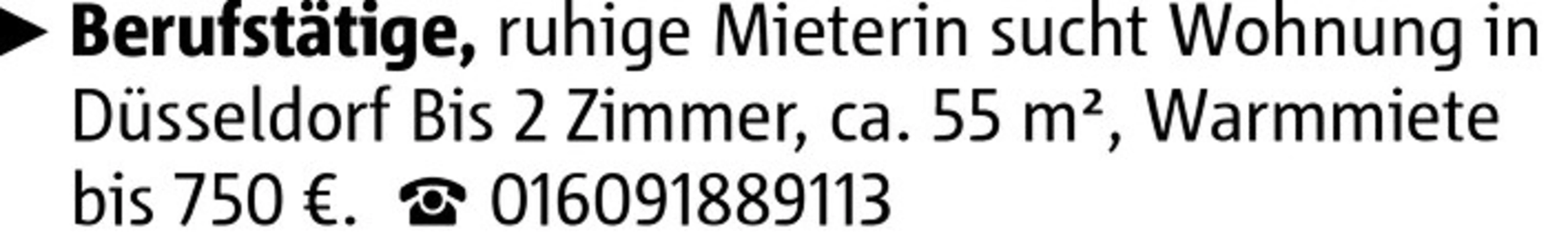Berufstätige, ruhige Mieterin sucht Wohnung in Düsseldorf Bis 2 Zimmer, ca. 55 m², Warmmiete bis 750 €. 016091889113