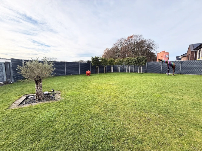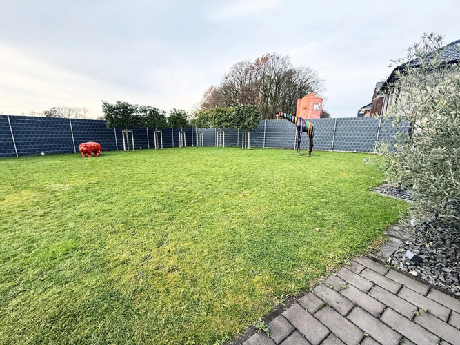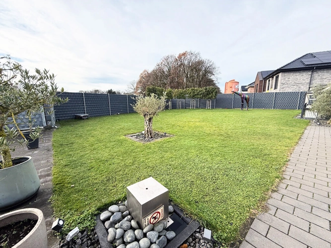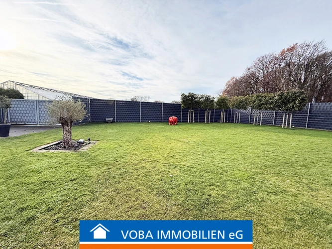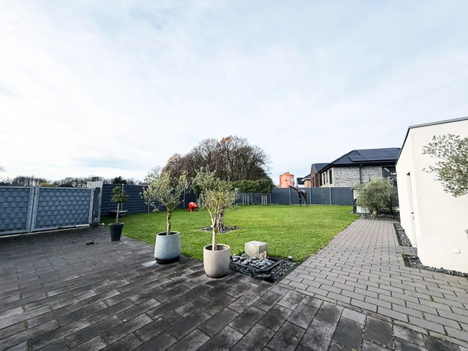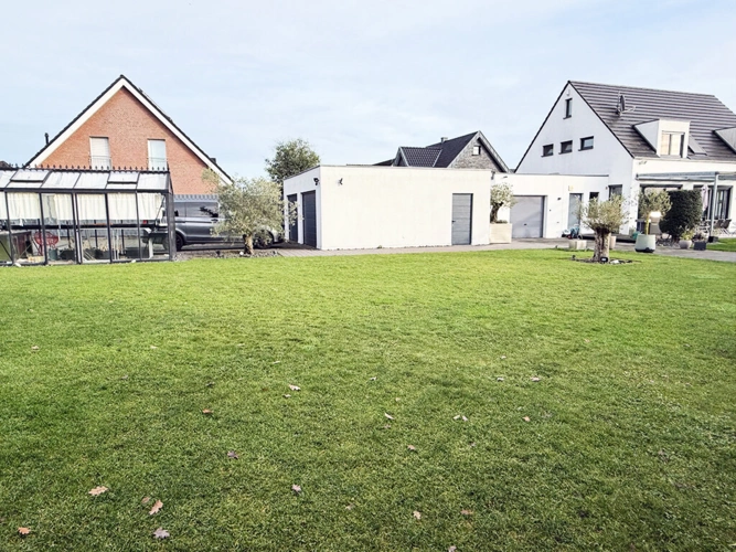 Die Außenanlagen sind ansprechend angelegt. Spalierbäume rahmen das Grundstück ein. Eine elektrische Gartenbewässerung ist ebenfalls verlegt. Die Auffahrt bis zur Garage ist gepflastert.
