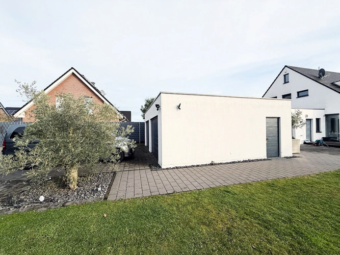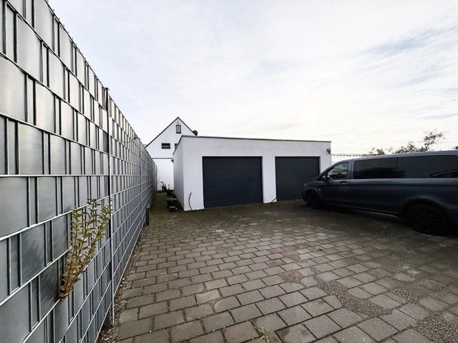Die bestehende Doppelgarage ist mit zwei Sektionaltoren ausgestattet und komplett gefliest.