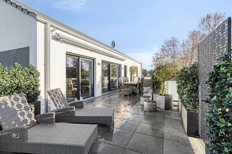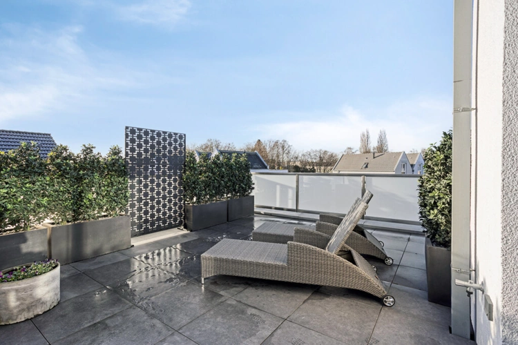 Ein besonderes Highlight stellt die große Dachterrasse dar, die einen eindrucksvollen Blick über die Dächer der Stadt bis hin zum Dom eröffnet. Sie erweitert den Wohnraum nach außen und lädt zu entspannten Stunden im Freien ein - sei es zum Frühstück, zum Relaxen oder zum Ausklang des Tages.