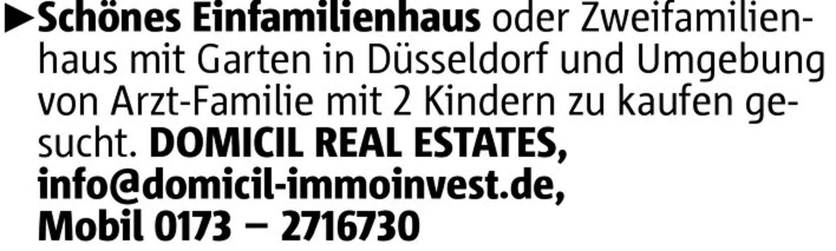 Schönes Einfamilienhaus oder Zweifamilienhaus mit Garten in Düsseldorf und Umgebung von Arzt-Familie mit 2 Kindern zu kaufen gesucht. DOMICIL REAL ESTATES, info@domicil-immoinvest.de, Mobil 0173 - 2716730