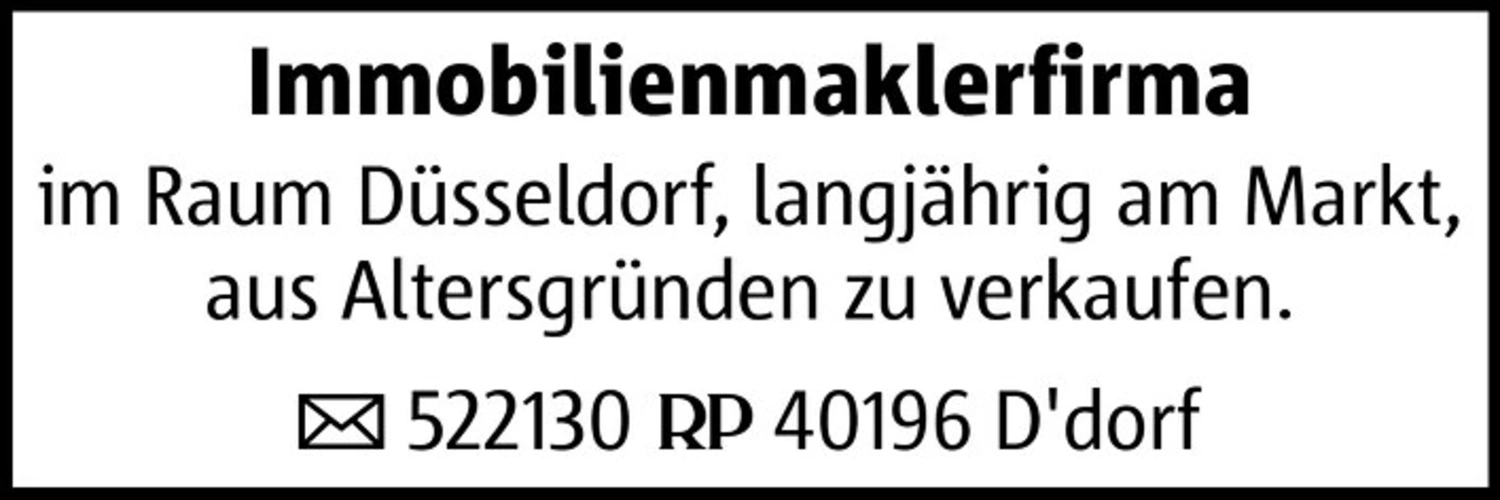 Immobilienmaklerfirma im Raum Düsseldorf, langjährig am Markt, aus Altersgründen zu verkaufen. 522130 40196 D'dorf