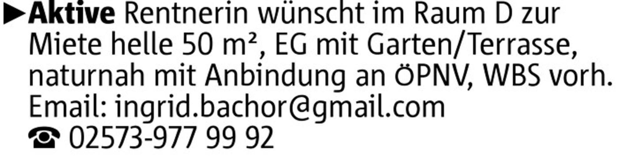 Aktive Rentnerin wünscht im Raum D zur Miete helle 50 m², EG mit Garten/Terrasse, naturnah mit Anbindung an ÖPNV, WBS vorh. Email: ingrid.bachor@gmail.com 02573-977 99 92