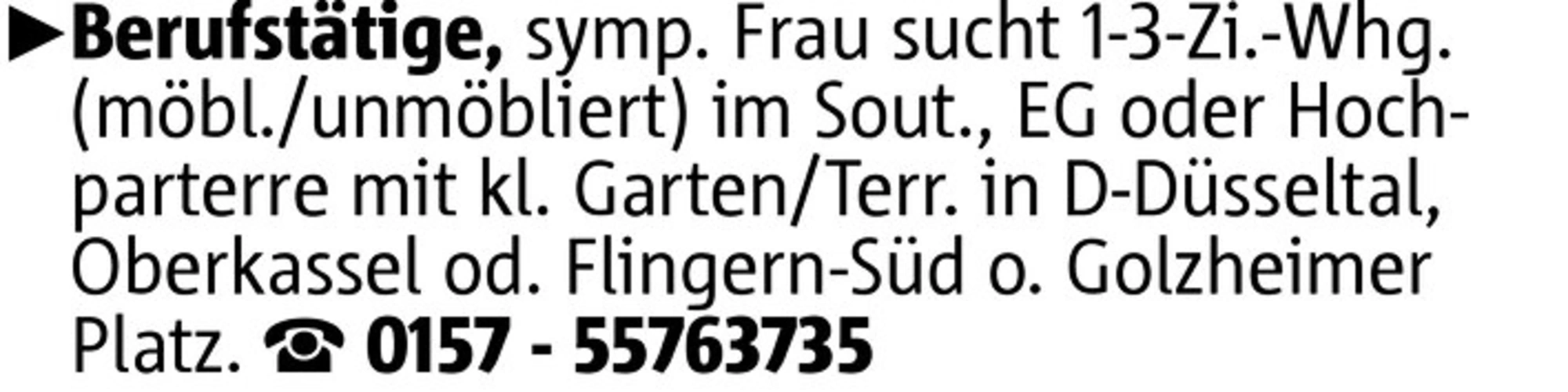 Berufstätige, symp. Frau sucht 1-3-Zi.-Whg. (möbl./unmöbliert) im Sout., EG oder Hochparterre mit kl. Garten/Terr. in D-Düsseltal, Oberkassel od. Flingern-Süd o. Golzheimer Platz. 0157 - 55763735