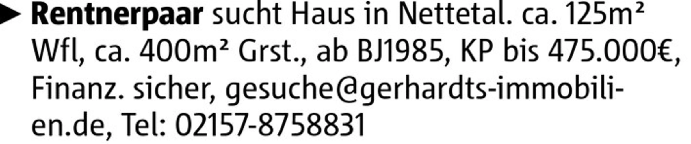 Rentnerpaar sucht Haus in Nettetal. ca. 125m² Wfl, ca. 400m² Grst., ab BJ 1985, KP bis 475.000€, Finanz. sicher, gesuche@gerhardts-immobilien.de, Tel: 02157-8758831
