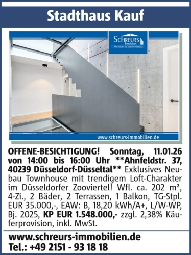 Stadthaus Kauf OFFENE-BESICHTIGUNG! Sonntag, 11.01.26 von 14:00 bis 16:00 Uhr Ahnfeldstr. 37, 40239 Düsseldorf-Düsseltal Exklusives Neubau Townhouse mit trendigem Loft-Charakter im Düsseldorfer Zooviertel! Wfl. ca. 202 m², 4-Zi., 2 Bäder, 2 Terrassen, 1 Balkon, TG-Stpl. EUR 35.000,-, EAW: B, 18,20 kWh/A+, L/W-WP, Bj. 2025, KP EUR 1.548.000,- zzgl. 2,38% Käuferprovision, inkl. MwSt. www.schreurs-immobilien.de Tel.: +49 2151 - 93 18 18