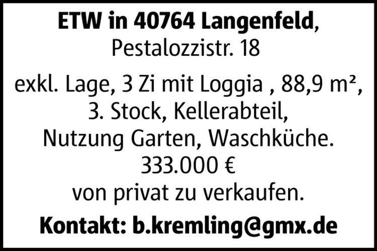 ETW in 40764 Langenfeld, Pestalozzistr. 18 exkl. Lage, 3 Zi mit Loggia , 88,9 m², 3. Stock, Kellerabteil, Nutzung Garten, Waschküche. 333.000 € von privat zu verkaufen. Kontakt: b.kremling@gmx.de
