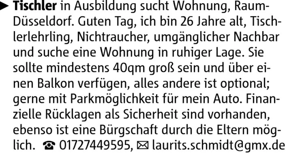 Tischler in Ausbildung sucht Wohnung, Raum Düsseldorf. Guten Tag, ich bin 26 Jahre alt, Tischlerlehrling, Nichtraucher, umgänglicher Nachbar und suche eine Wohnung in ruhiger Lage. Sie sollte mindestens 40qm groß sein und über einen Balkon verfügen, alles andere ist optional; gerne mit Parkmöglichkeit für mein Auto. Finanzielle Rücklagen als Sicherheit sind vorhanden, ebenso ist eine Bürgschaft durch die Eltern möglich. 01727449595, laurits.schmidt@gmx.de