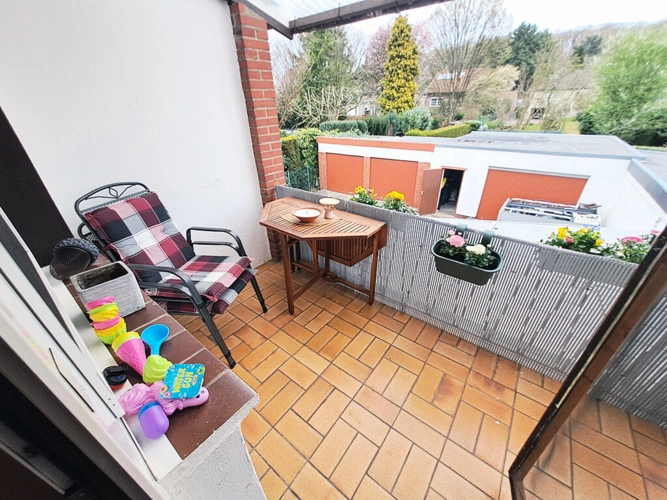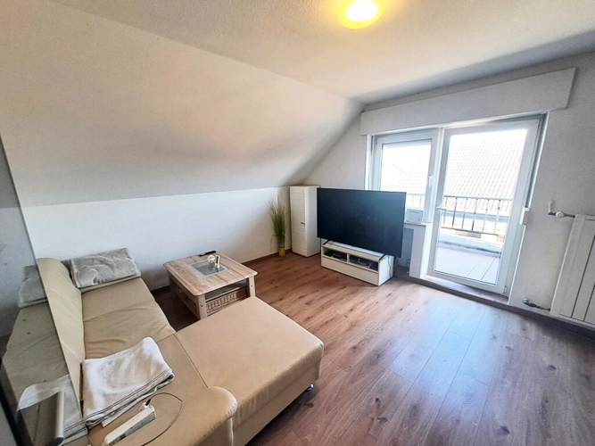 Dachgeschoss (ca. 27 m²): Wohnzimmer (mit Küchenzeile und Balkonzugang), Schlafzimmer, Diele, Bad