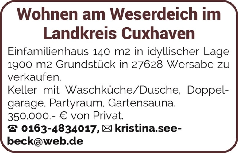 Wohnen am Weserdeich im Landkreis Cuxhaven Einfamilienhaus 140 m² in idyllischer Lage 1900 m² Grundstück in 27628 Wersabe zu verkaufen. Keller mit Waschküche/Dusche, Doppelgarage, Partyraum, Gartensauna. 350.000.- € von Privat. 0163-4834017, kristina.seebeck@web.de