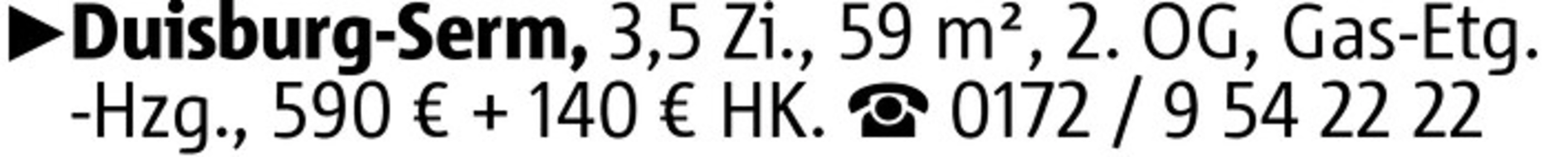 Duisburg-Serm, 3,5 Zi., 59 m², 2. OG, Gas-Etg. -Hzg., 590 € + 140 € HK. 0172 / 9 54 22 22