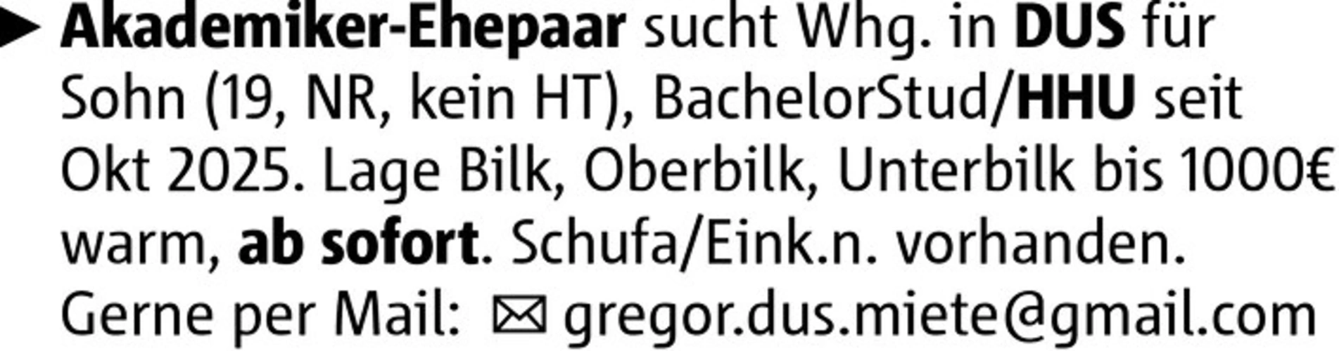 Akademiker-Ehepaar sucht Whg. in DUS für Sohn (19, NR, kein HT), Bachelor Stud/HHU seit Okt 2025. Lage Bilk, Oberbilk, Unterbilk bis 1000€ warm, ab sofort. Schufa/Eink.n. vorhanden. Gerne per Mail: gregor.dus.miete@gmail.com