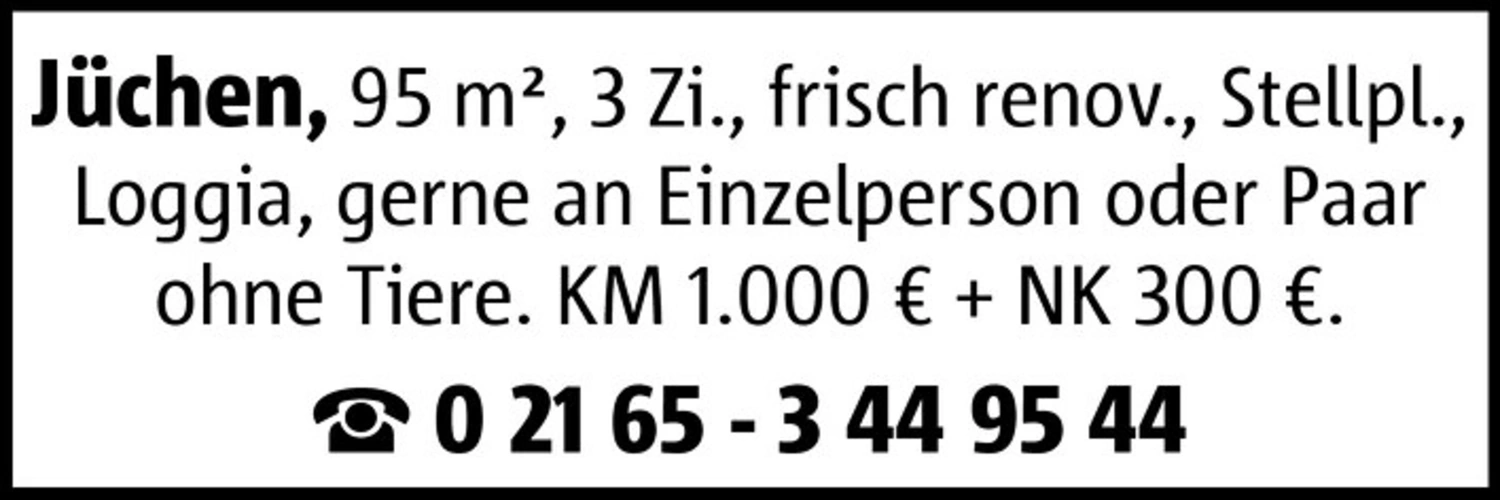 Jüchen, 95 m², 3 Zi., frisch renov., Stellpl., Loggia, gerne an Einzelperson oder Paar ohne Tiere. KM 1.000 € + NK 300 €. 0 21 65 - 3 44 95 4