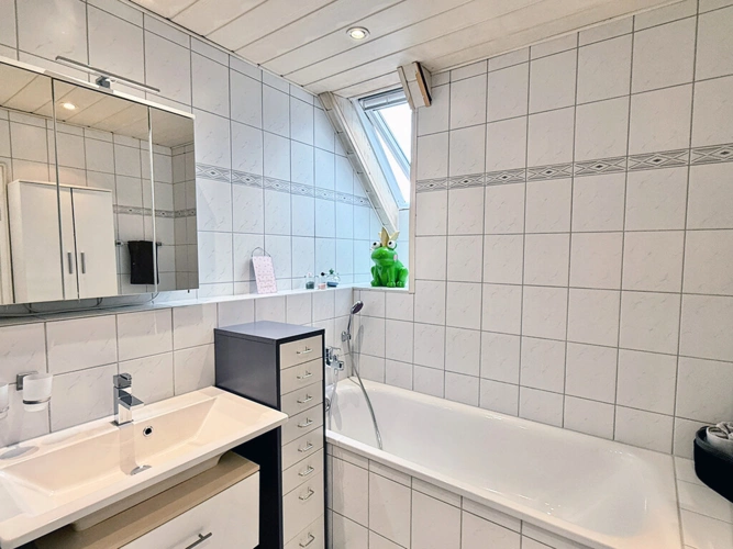 Diese interessante Wohnung befindet sich im Dachgeschoss eines Vierparteienhauses, das um 1974 auf einem ca. 892 m² großen Grundstück in unterkellerter Massivbauweise errichtet wurde.
