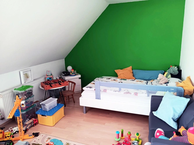 Das sukzessive renovierte Eigentum mit ca. 110 m² gut aufgeteilter Wohnfläche (ohne anteilige Terrassenfläche) bietet einer jungen Familie mit fünf Zimmern, Küche, Diele, Gäste-WC sowie zwei Bädern (im Dach- und Kellergeschoss) ausreichend Platz zur individuellen Entfaltung.